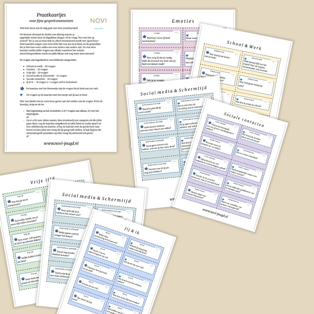 Met deze kaartjes stel jij vragen aan je kind én stelt je kind vragen aan jou. Dat zorgt voor meer verbinding en minder haast. Het hoeft niet perfect en ook niet ingewikkeld, maar gewoon samen. Voor het slapengaan, in de auto, tijdens het wandelen, na het eten of gewoon tussendoor.
